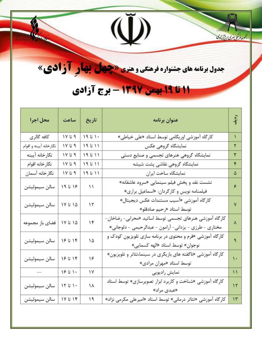 به گزارش روابط عمومی دانشگاه جامع علمی کاربردی استان تهران غرب، به مناسبت چهلمین سالگرد پیروزی انقلاب اسلامی مرکز آموزشی علمی کاربردی فرهنگ و هنر واحد ۴۶ دانشگاه جامع علمی کابردی استان تهران غرب با همکاری مجموعه فرهنگی هنری برج آزادی و بنیاد رودکی جشنواره فرهنگی چهل بهار آزادی را در محل برج آزادی در تاریخ های ۹۷/۱۱/۱۱ الی ۹۷/۱۱/۱۹ برگزار میکند.شایان ذکر است در این جشنواره برنامه های متنوع در قالب موضوعات مختلف هنری از جمله اجرای رادیو ،برگزاری تئاتر،نمایش فیلم،صنایع دستی، نمایشگاه عکس،کارگاه های آموزشی و نمایشگاه هنرهای تجسمی ، با حضور اساتید مجرب و چهره برگزار می گردد.