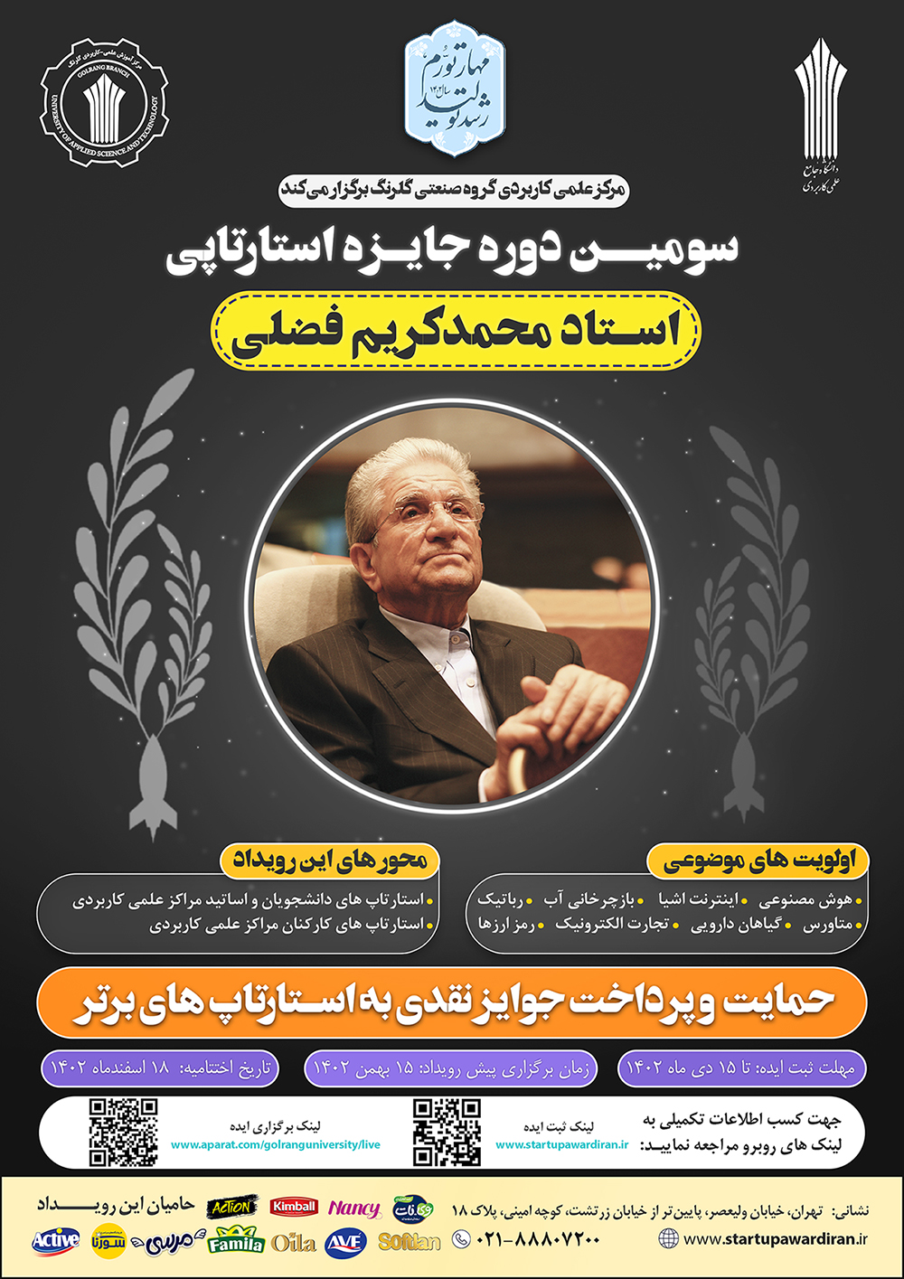 با عنایت به برگزاری دو دوره موفق جایزه بزرگ استارتاپی گلرنگ و استقبال کمنظیر فناوران و نوآوران از این رویداد به استحضار میرساند، در نظر است "سومین دوره جایزه استارتاپی استاد محمدکریم فضلی (بنیانگذار فقید گروه صنعتی گلرنگ)" در سطح ملی و به همت مرکز آموزش علمی کاربردی گروه صنعتی گلرنگ در تاریخ 18 اسفندماه سال 1402 برگزار شود.