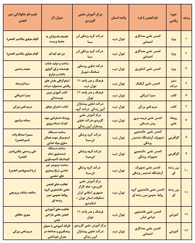 گفتنی است در این جشنواره ، دانشگاه جامع علمی کاربردی استان تهران غرب با ارسال ۱۵۲ اثر توانست ۱۳ مقام را به شرح ذیل کسب کند.